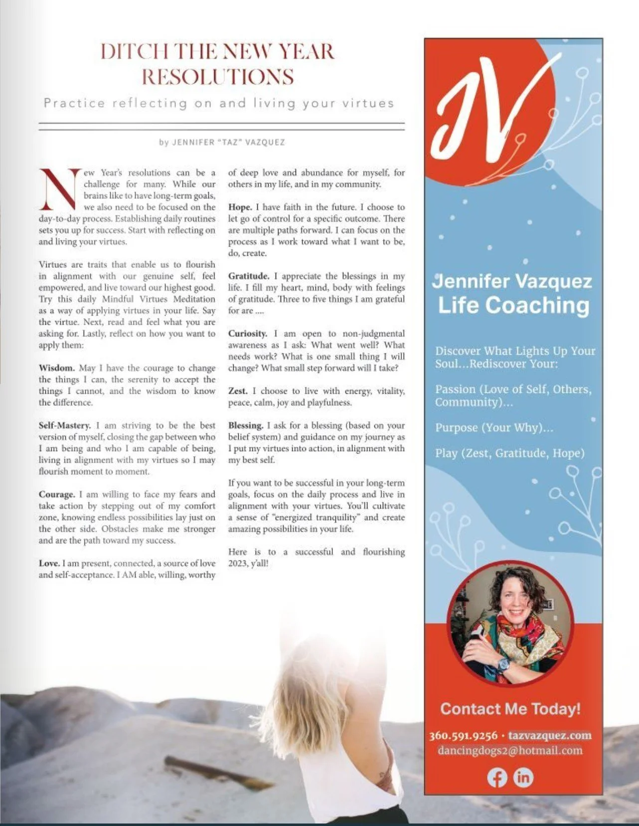 Blog Jennifer Vazquez 3/2/23 Jennifer Vazquez 3/2/23 Want to Feel Inspired and Succeed? - Dream Bigger! Read More Jennifer Vazquez 2/1/23 Jennifer Vazquez 2/1/23 Ditch the New Year Resolutions - Practice Reflecting on and Living Your Virtues Read More Jennifer Vazquez 1/2/23 Jennifer Vazquez 1/2/23 How to Get Out of Your Comfort Zone - Embrace “When Pigs Fly” Read More Jennifer Vazquez 12/22/22 Jennifer Vazquez 12/22/22 Want to Feel More “Zest” in Life? Simple…Move! Read More Jennifer Vazquez 12/21/22 Jennifer Vazquez 12/21/22 Want More Zest, Gratitude, and Hope in Your Life? Get Curious - How Present Are You? Read More Newer Posts Older Posts